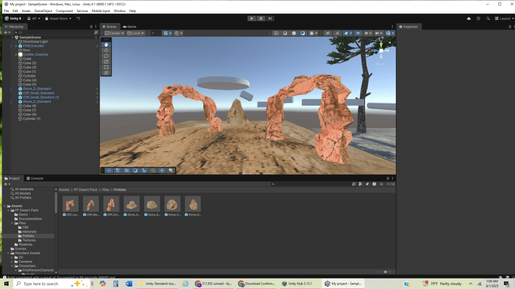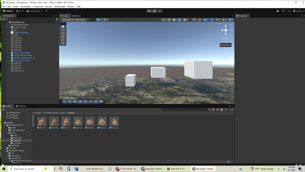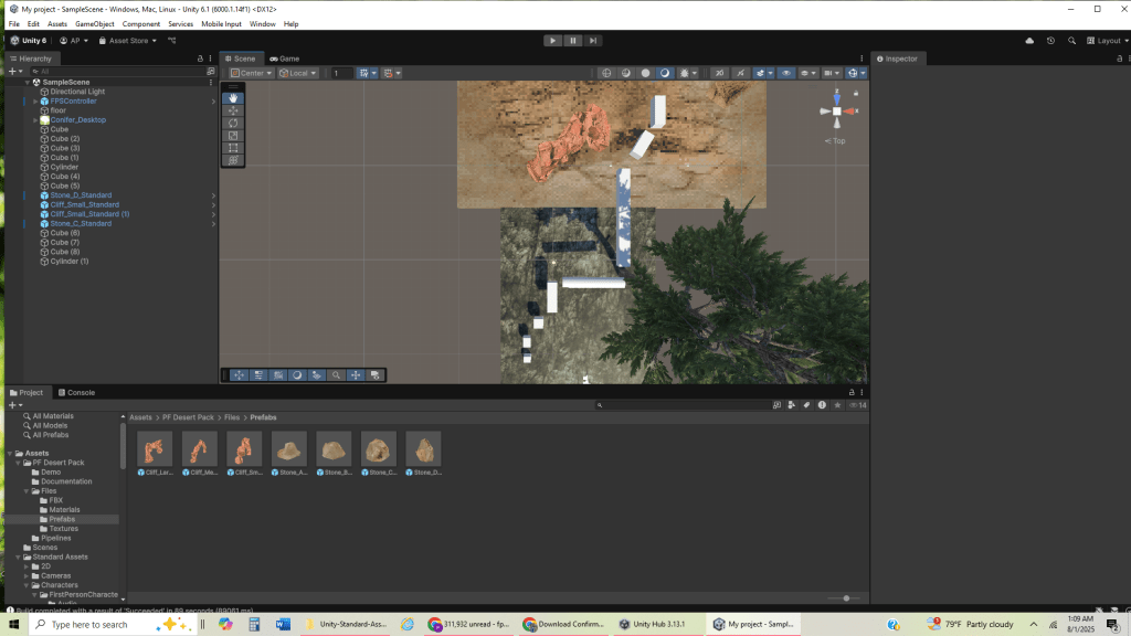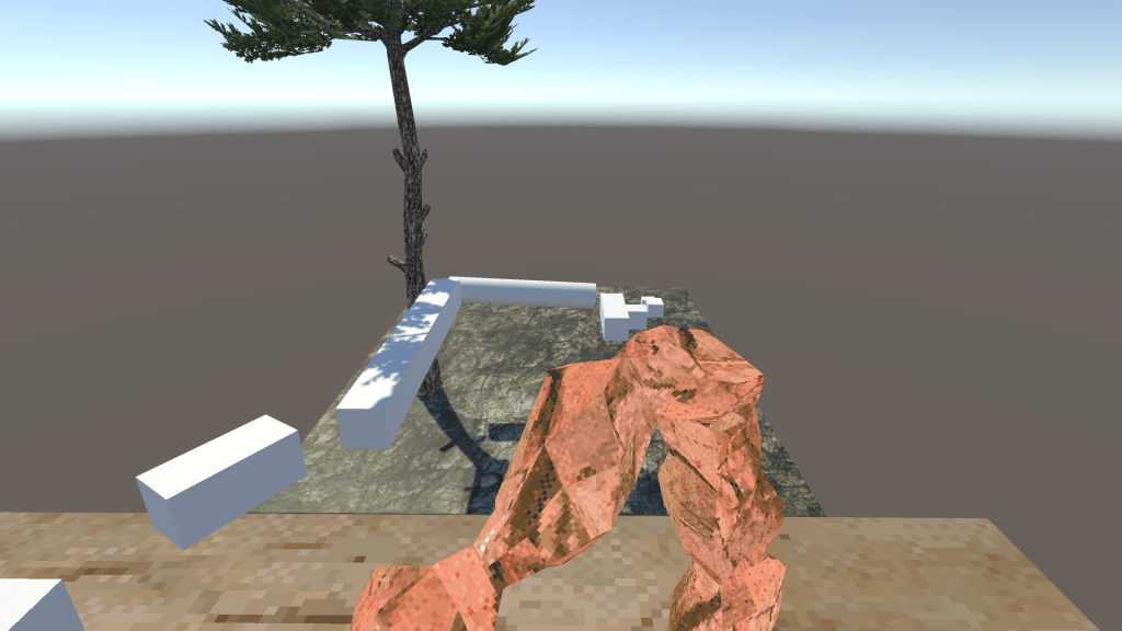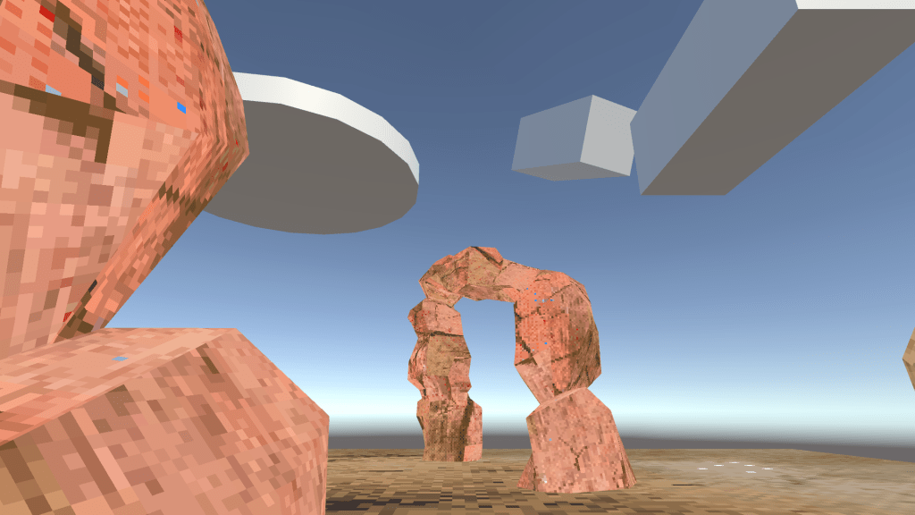 I then used a desert terrain pack from the Asset Store (https://assetstore.unity.com/packages/3d/environments/landscapes/pf-desert-pack-free-3d-psx-retrostyle-304703) to create a different landscape than the start, so that as the player progressed, they would change environments, showing progression.