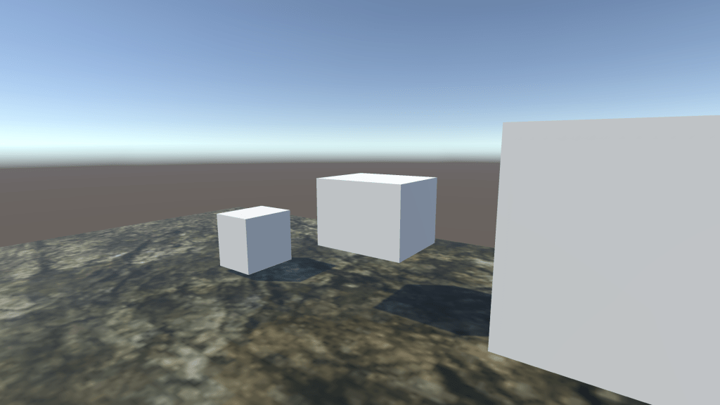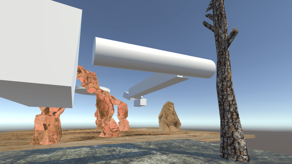 I then knew that I had wanted a change of terrain or environment, so I built floating blocks to the end of my grass plain and added a new cube to use as my “second level”. I also used a rotated cylinder to have shapes other than cubes in my game.